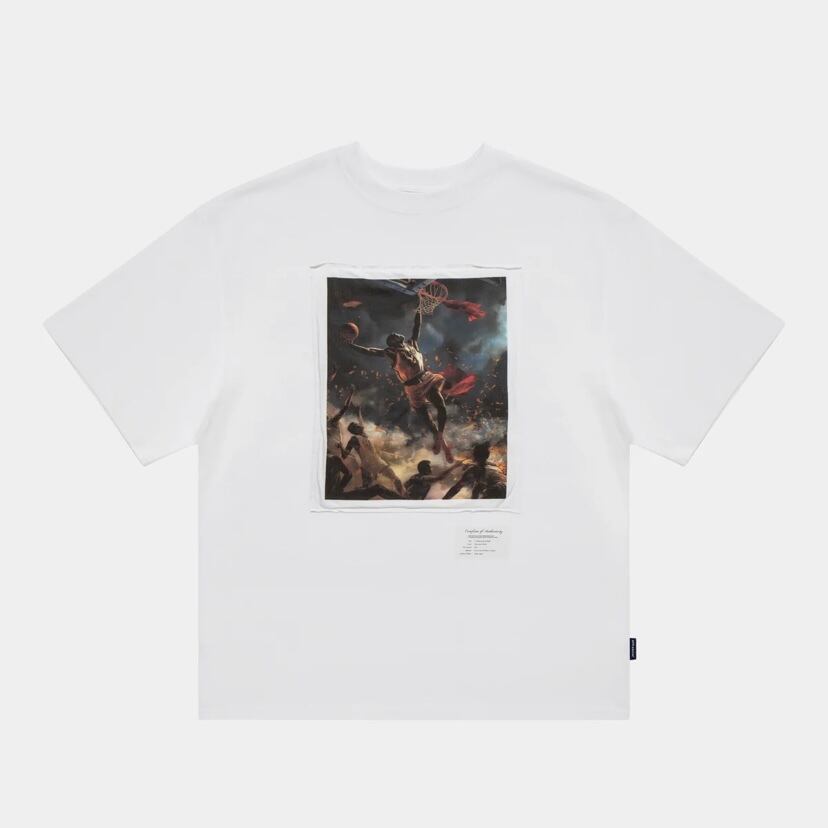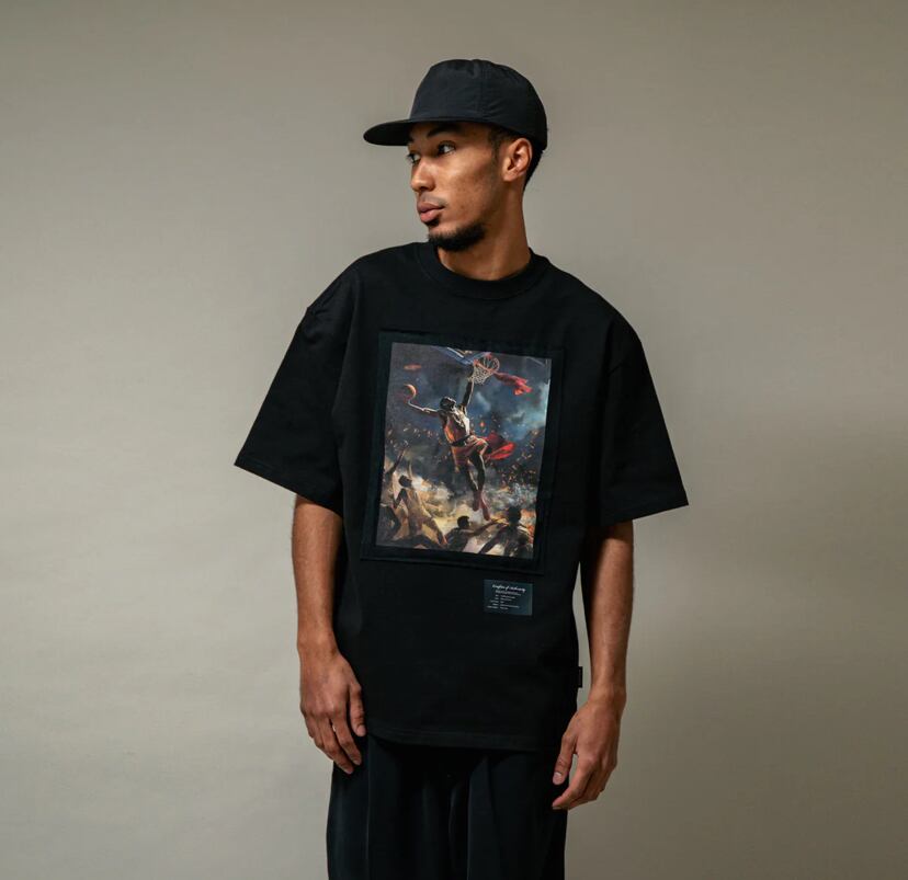 西洋画「民衆を導く自由の女神」からインスパイアされたグラフィックを落とし込んだTシャツ。